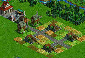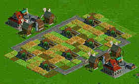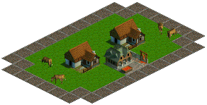 Das Rinderkombinat besteht aus 2 Rinderfarmen und einer Fleischerhütte, siehe Abb.rechts (die Steine drumrum dienen nur zum Felderzählen) Kosten: 2 Farmen a 100 = 200 1 Fleischer = 150, zusammen 350 Taler Flächenbedarf: 56 Felder, Ertrag: 2.3 t pro Zyklus |