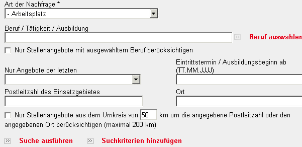 Sieht recht einfach aus, aber wenn man auf "Beruf auswählen" klickt, wird man vom Angebot erschlagen. Das ist dermassen spezialisiert, anscheinend ist jeder Beruf in Deutschland, der irgendwann mal ausgeübt wurde, dort aufgeführt. Mein Tip: nur die Postleitzahl des gewünschten Ortes eintragen, bei der Umkreissuche ein Häkchen machen, Entfernung auswählen und auf "Suche ausführen" klicken. Sie bekommen genau 100 Angebote, die kann man recht schnell durchsehen und hat schon mal die Angebote aus der Nachbarschaft gesichtet. Da es nie mehr als 100 Angebote sind, sollte man auch die umliegenden Orte auswählen und absuchen lassen. | |||||||||||||||||||||||||||||||||||||||||||||||||||||||||||||||||||||||||||||||||||