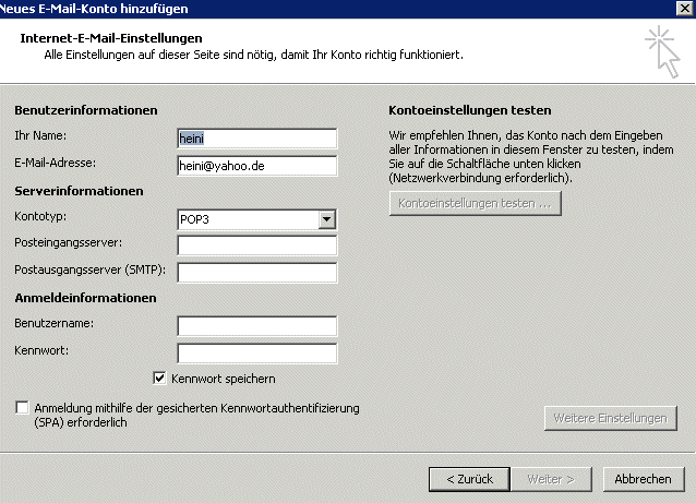 Ihren Namen (ist für die Anmeldung egal) und e-mail-Adresse (Ihre neue) eintragen, und in den Unterlagen Ihres Anbieters das Kennwort (Passwort) suchen und eintragen. Wichtig: Machen Sie einen Haken unten Links bei "Servereinstellungen..." --> Weiter | |||||||||||||||||||||||||||||||||||||||||||||||||||||||||||||||||||||||||||||||||||